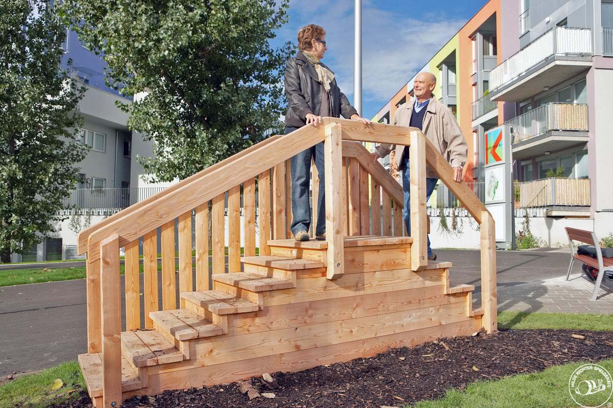The stations, based on real-life situations, invite you to try them out and exercise. Alongside agility, stamina is also trained in this circuit course. The path is set up so that not all the obstacles need to be overcome and so that an accompanying person can give best possible help. Handrails on both sides at every station additionally ensure the highest safety.