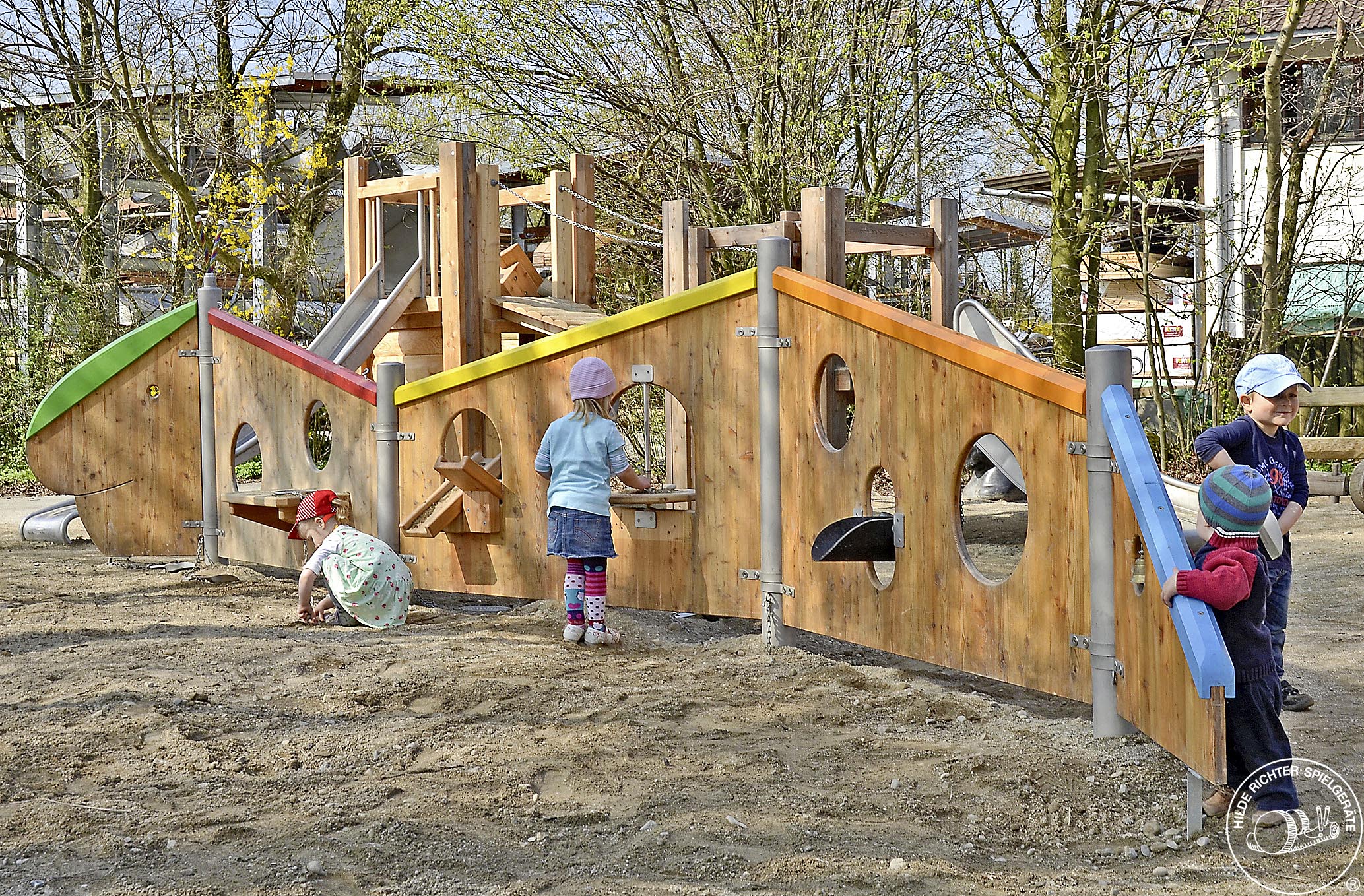 The caterpillar is a friendly play offer for small children. The harmonious appearance of the figure and the way in which it is possible to play from both sides offer a lively and pleasant basis for smaller playing spaces. The space partitions promote communicative play, but also make it possible to create borders and divisions of the play areas. Alongside there are many different sand play offers such as sand shovel, sand dump, sieve, turntable, baking table and sand channels.Recommended For